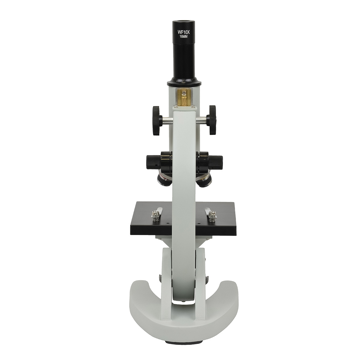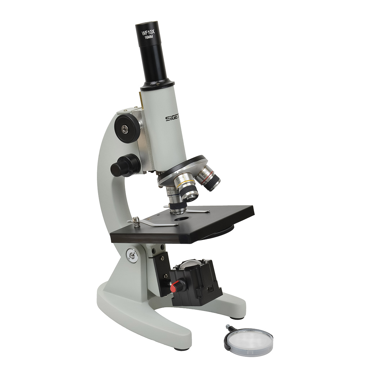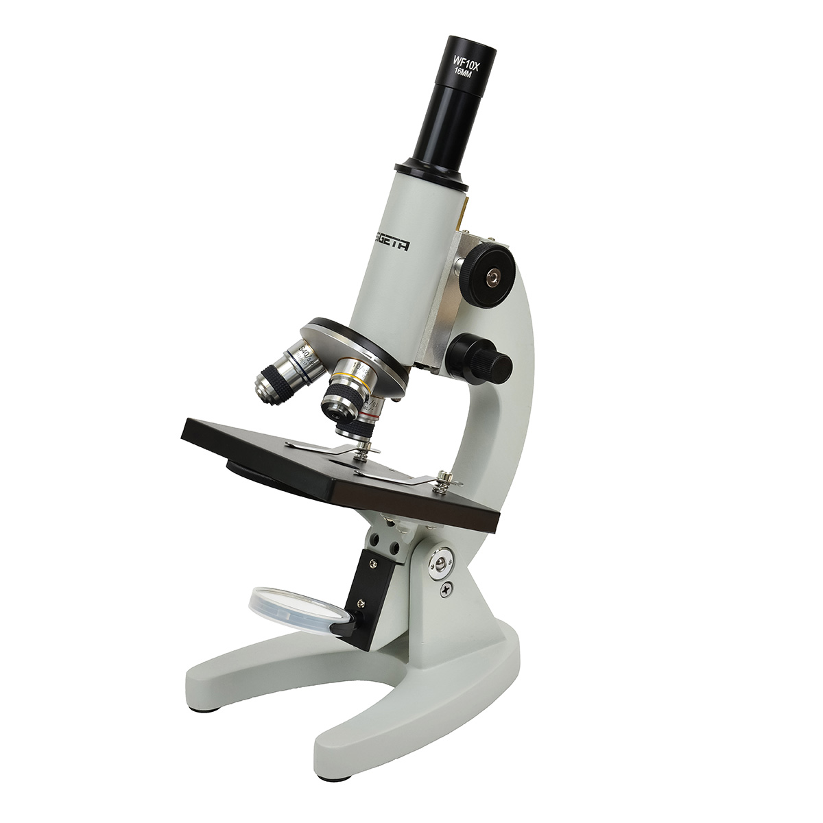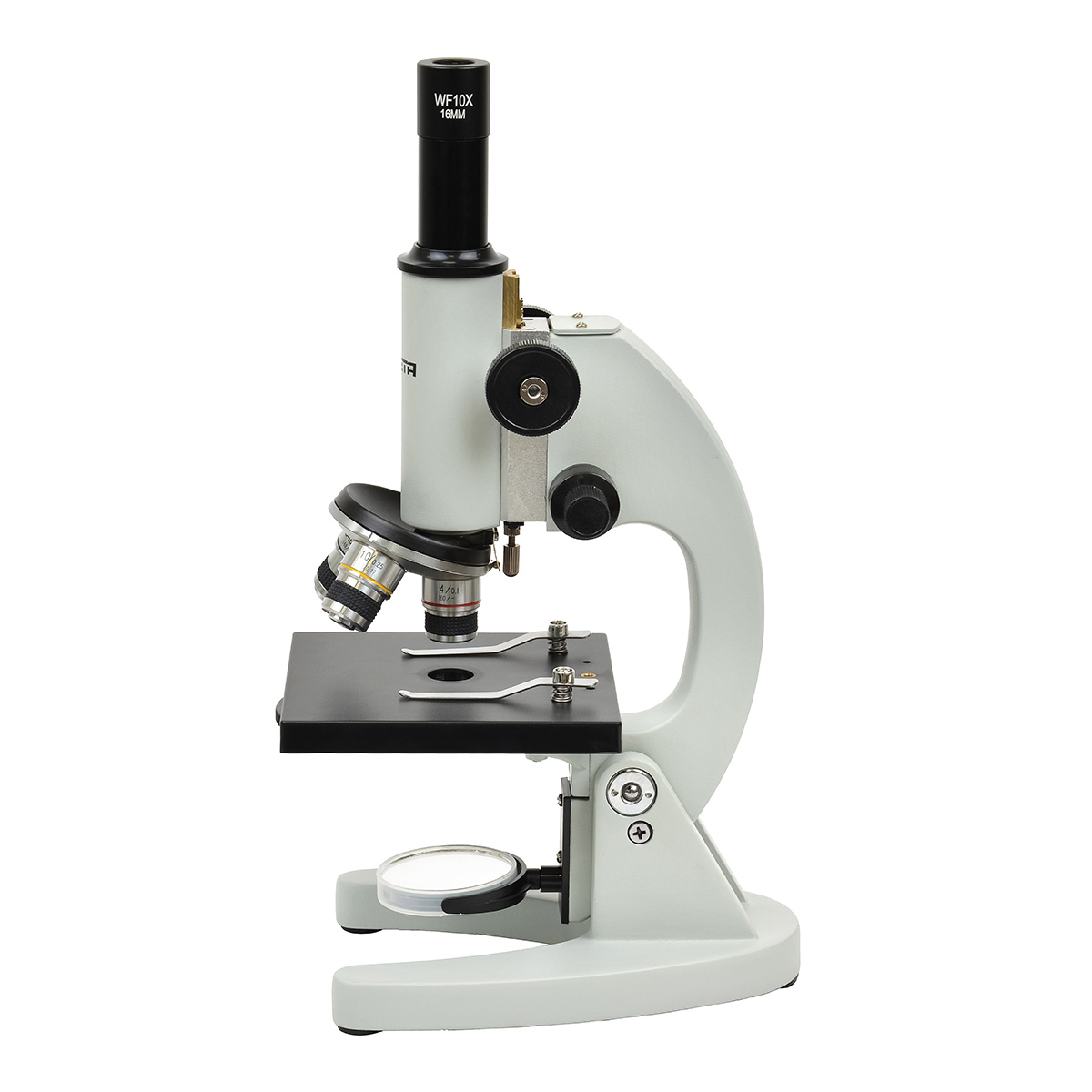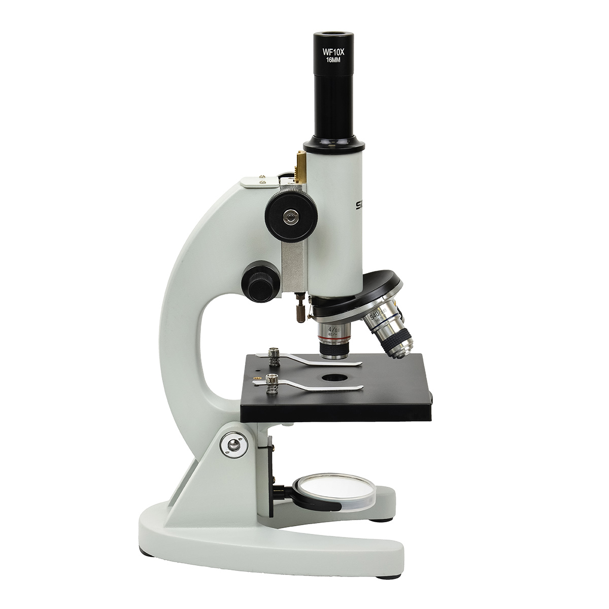 Мікроскоп оснащений трисекційною револьверною головкою з об’єктивами 4x, 10x і 40x, які у поєднанні з окуляром WF10x дають три рівні збільшення: 40x, 100x і 400x. Такий діапазон дозволяє спостерігати клітини, мікроорганізми, структуру тканин і багато інших біологічних об’єктів. Оптична система з ахроматичними об’єктивами забезпечує високу чіткість і контрастність зображення без кольорових спотворень, а гвинтовий обмежувач ходу оптичного блоку запобігає пошкодженню об’єктива або покривного скла під час фокусування.