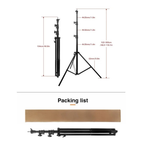 Фотостійка виготовлена з алюмінію, що забезпечує її міцність при відносно невеликій власній вазі 2.56 кг. Вона має три секції, що дозволяє регулювати робочу висоту від 122 см до 300 см, а в складеному стані її розмір становить 104 см, що зручно для транспортування. Максимальне навантаження, яке може витримати стійка, становить 6 кг, що робить її сумісною з більшістю видів студійного обладнання.